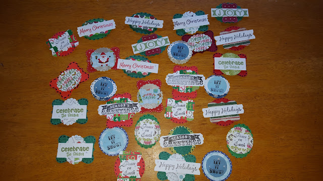 So slowly, I am getting back into my craft room and I started with making some Christmas gifts. Sorry can't post those! heehee Santa wouldn't approve but what I can post are the lovely tags I was able to make from my scraps. First I made a trip to the Dollar Tree to get some file folders. These can turn out at least 80 tags when cut up. You get 10 folders in a pack. Take 1 folder, cut off the tabs (save these to make grommets) and cut the folder in half. Then cut each piece into 2 3/4 x 6 1/2 tags. These are large so you will get 4 from each half folder. Totally 80 if you do them all this size. I love this size tag and it is the one I use the most. Another great medium size is 2 3/4 x 5 1/2 and a smaller size of 2 3/4 x 4. You should be able to get 10 tags from each half if you use these sizes and that would be a whopping 100 tags from just one $1 pack!!! Now that's a deal!
